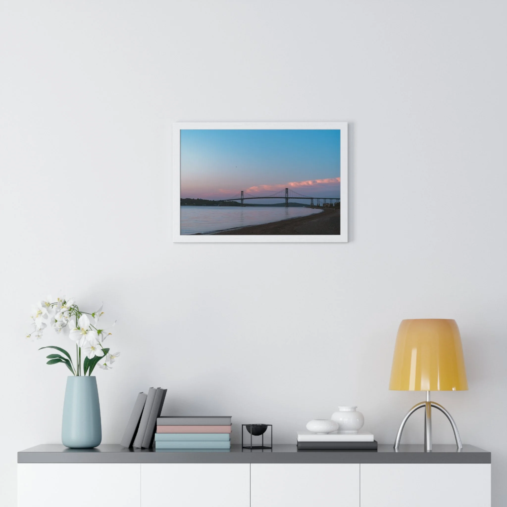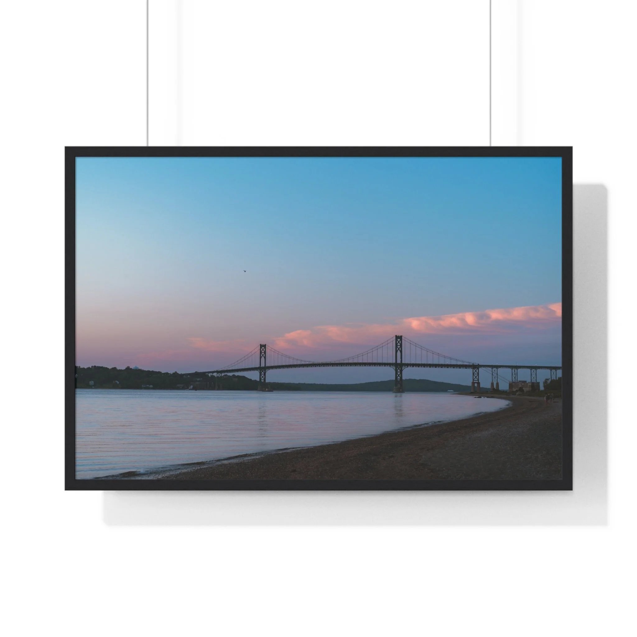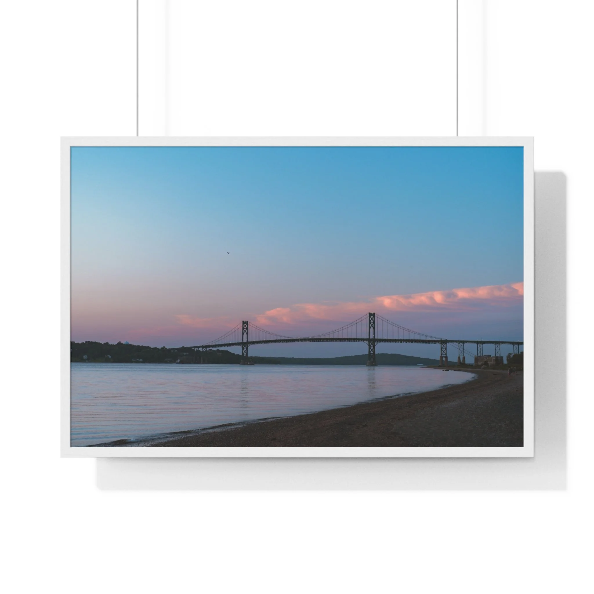 A serene horizontal framed poster that captures a soft coastal dusk—muted pink clouds drifting above a calm bay, a distant suspension bridge, and smooth shoreline contours. The matte, museum-grade print brings out subtle gradients with pigment inks, while the slim wooden frame and plexiglass front give the piece a refined, gallery-ready presence. It arrives ready to hang with pre-installed hardware and multiple size options so it slips effortlessly onto a living room wall, entryway, or office display. The mood is quiet and reflective, drawing the eye and slowing the breath each time you pass it.