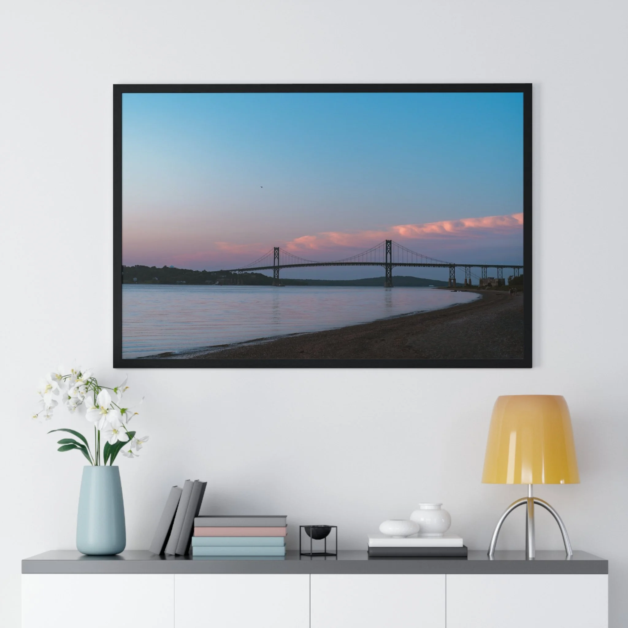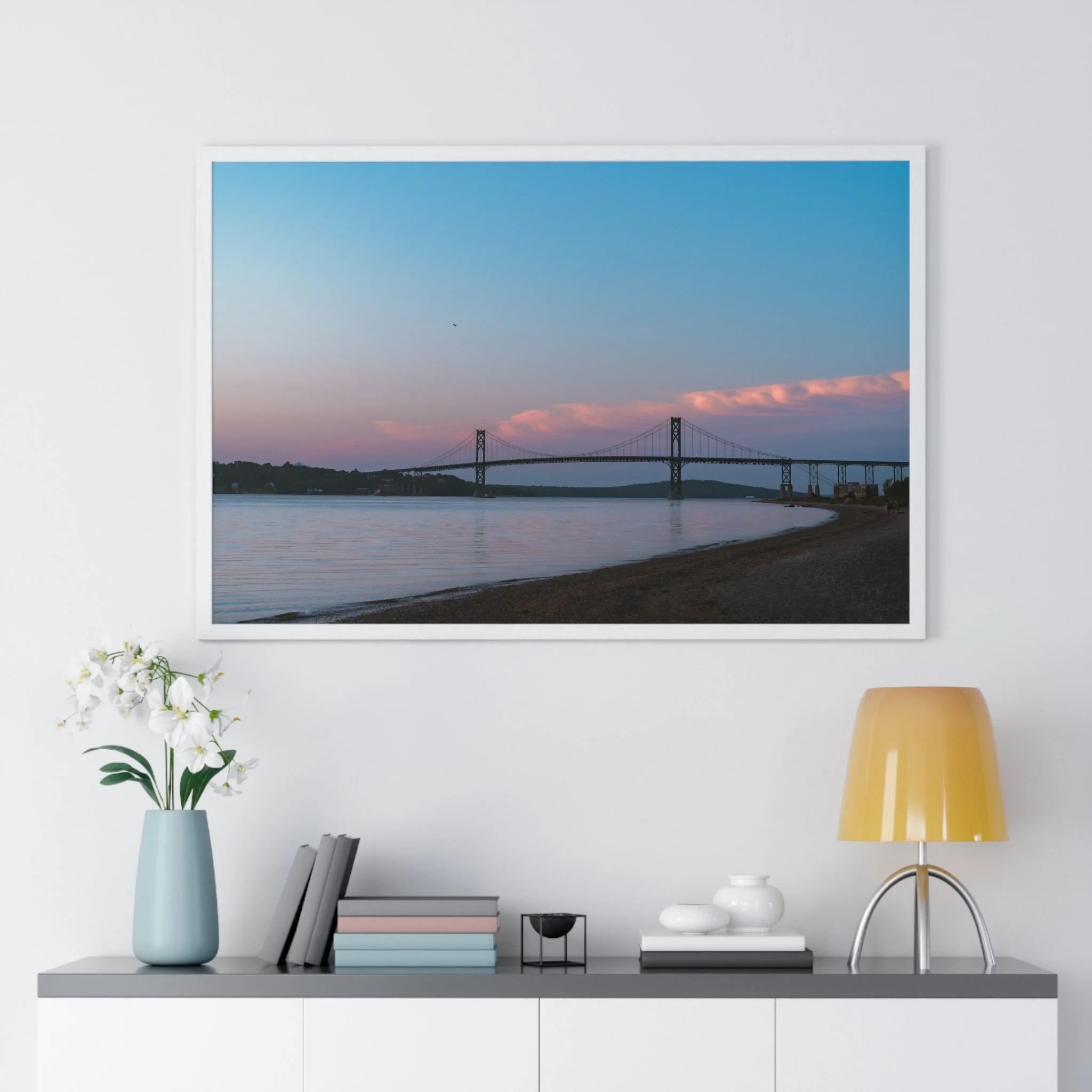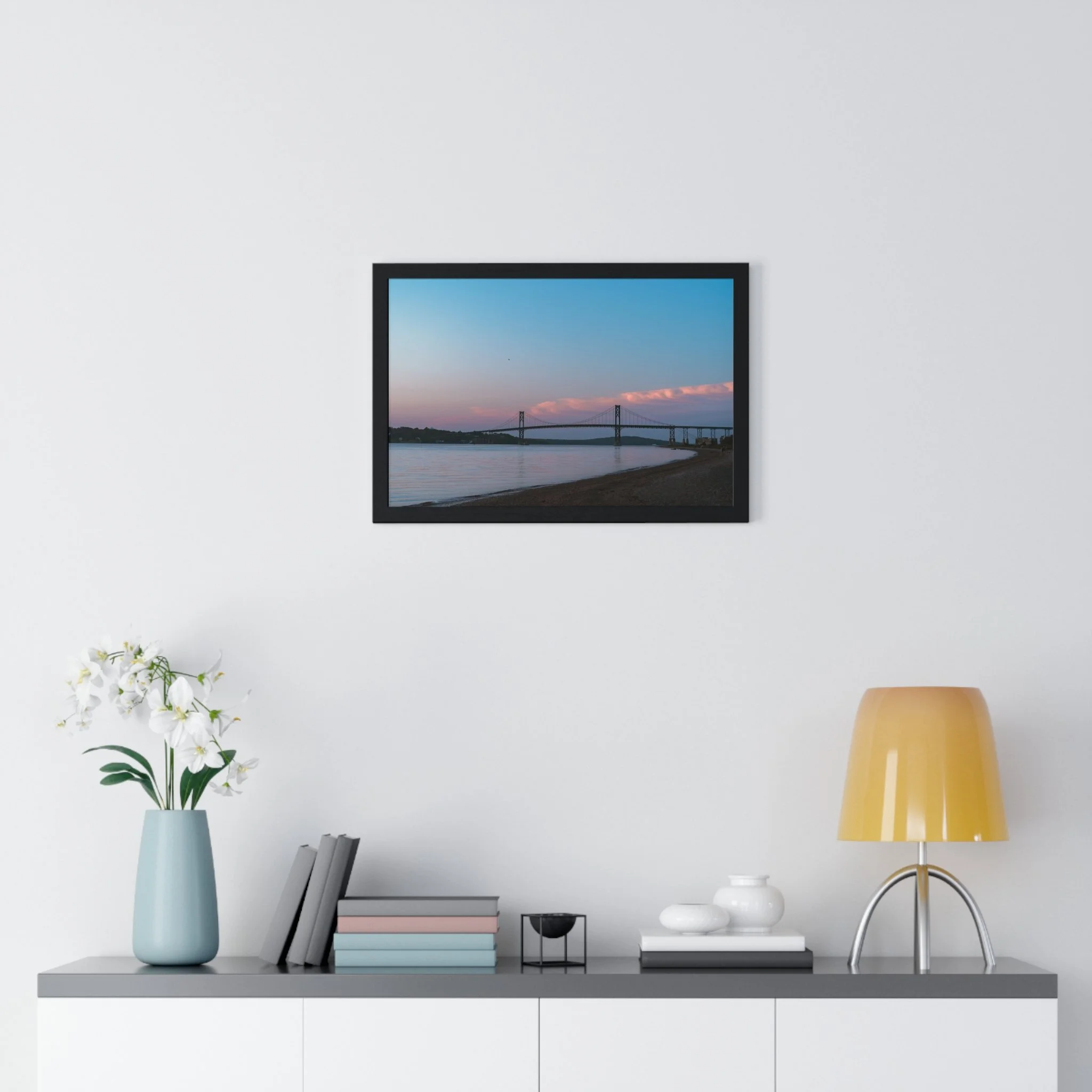 A serene horizontal framed poster that captures a soft coastal dusk—muted pink clouds drifting above a calm bay, a distant suspension bridge, and smooth shoreline contours. The matte, museum-grade print brings out subtle gradients with pigment inks, while the slim wooden frame and plexiglass front give the piece a refined, gallery-ready presence. It arrives ready to hang with pre-installed hardware and multiple size options so it slips effortlessly onto a living room wall, entryway, or office display. The mood is quiet and reflective, drawing the eye and slowing the breath each time you pass it.